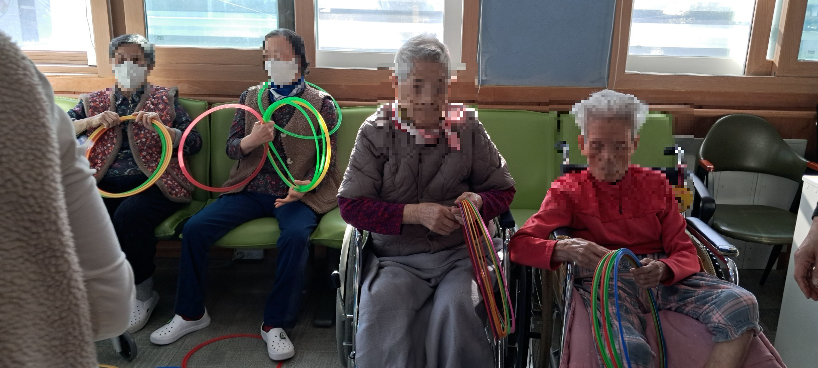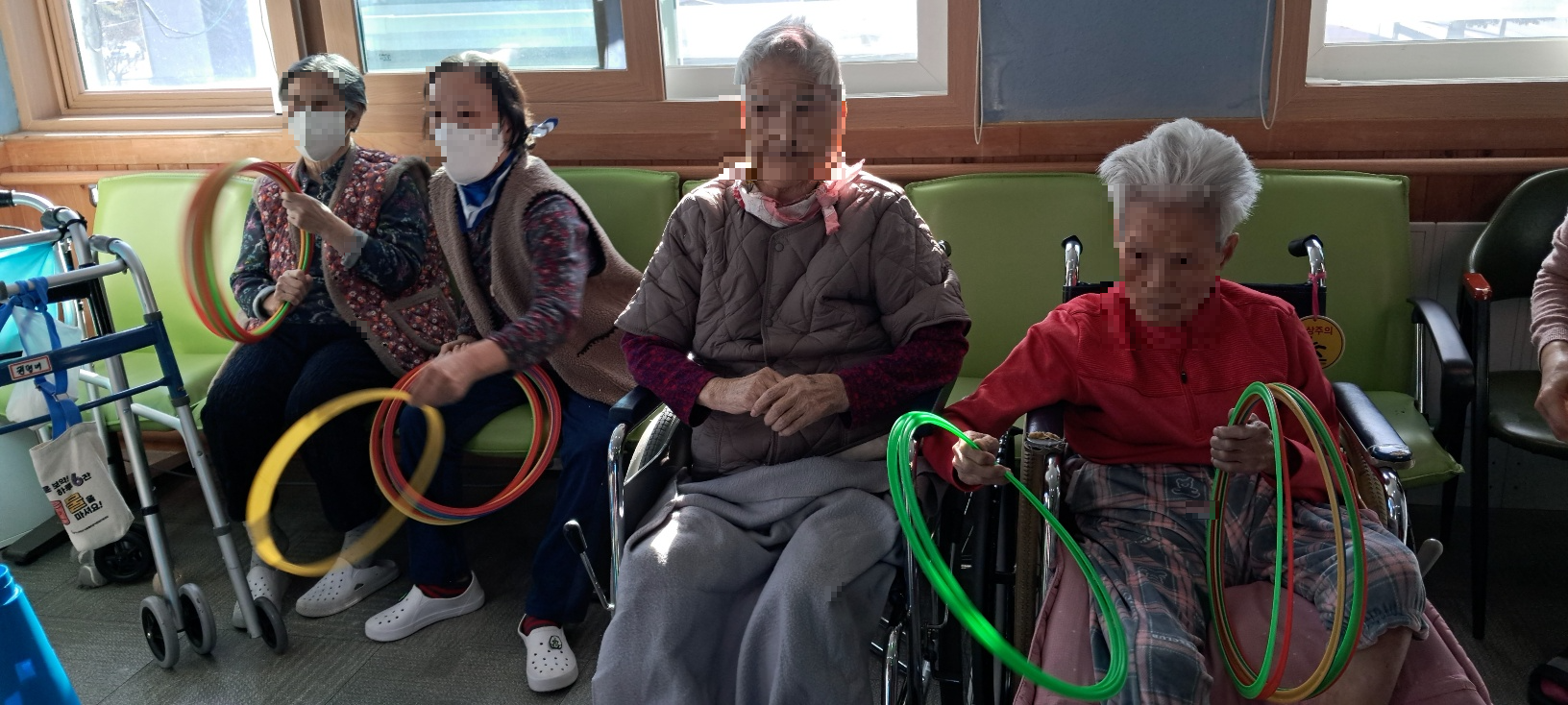 🌀밝은 음악이 흘러나오자 어르신들의 얼굴에 미소가 번집니다. 원형으로 자리 잡고 앉으신 어르신들 사이로 알록달록한 훌라후프가 준비되어 있고, 진행자가 큰 목소리로 외칩니다.